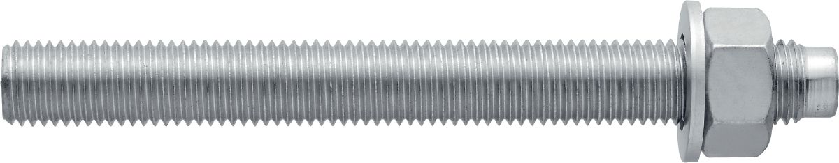 High-performance anchor rod for injectable hybrid/epoxy anchors (5.8 carbon steel) Material, corrosion: Carbon steel, zinc-plated Environmental conditions: Dry indoor Base materials: Concrete (cracked), Concrete (non-cracked), Masonry (hollow), Masonry (solid)